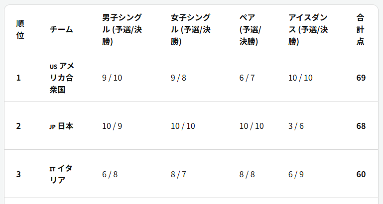 | 009 | 名無しさん | 2026/02/06(金) 18:53:25 | 今、フィギュアの団体予選やってるけど日本 | 画像なし |